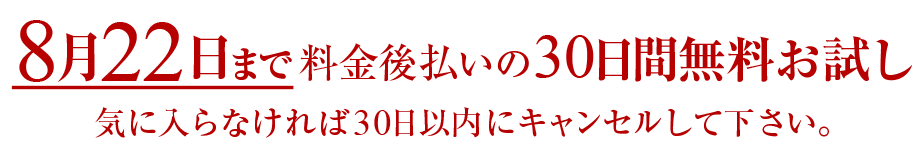 安心して体験できるように、最初の30日は無料(送料550円のみお支払い)でお試しができます(商品代金は30日後のお支払いです)もし試してみて満足しなかった場合は、30日以内にご返品ください。そうすれば商品代金の請求は取消します。そして、さらに、、、